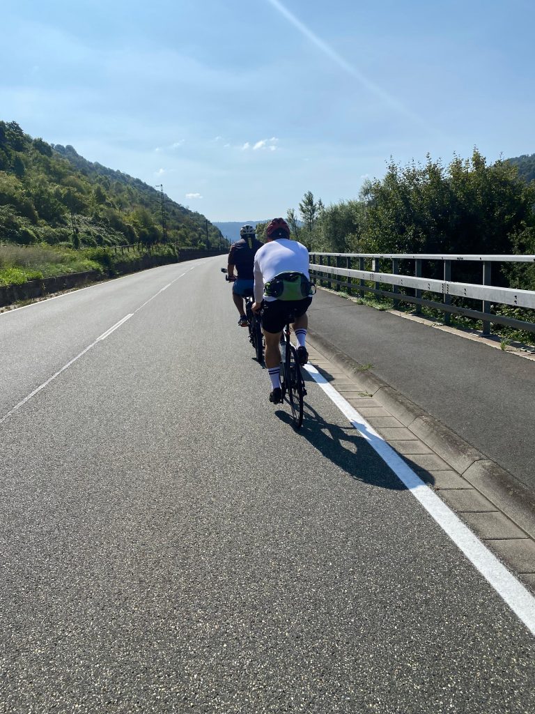Etwa 30 Kilometer mussten wir auf Bundesstraßen fahren, meist jedoch auf Fahrradwegen daneben. Auf der Straße fuhren wir hintereinander und wechselten uns regelmäßig an der Spitze ab, um den Windschatten zu nutzen. Mein Windschatten für Thomas fiel etwas kleiner aus doch nach 20 Kilometern, kurz hinter der Loreley, hatten wir Glück. Ein E-Biker mit rund 30 km/h Geschwindigkeit bot uns für zehn Kilometer einen perfekten Windschatten an. Nach kurzem Kontakt mit Ihm gab er die Erlaubnis weiter hinter Ihm zu bleiben, Er bezeichnete sich selbst als „schöne Schaltafel“.