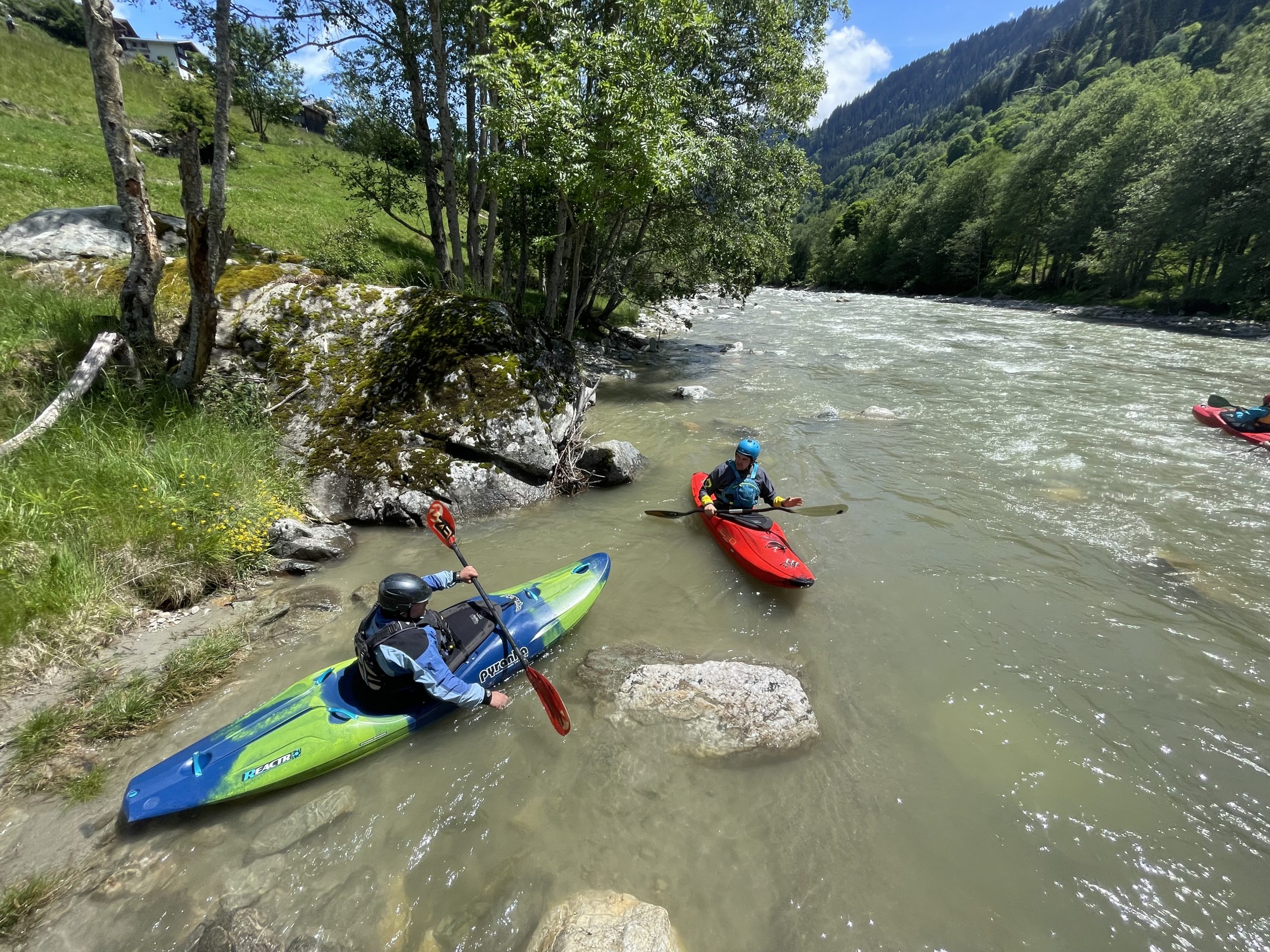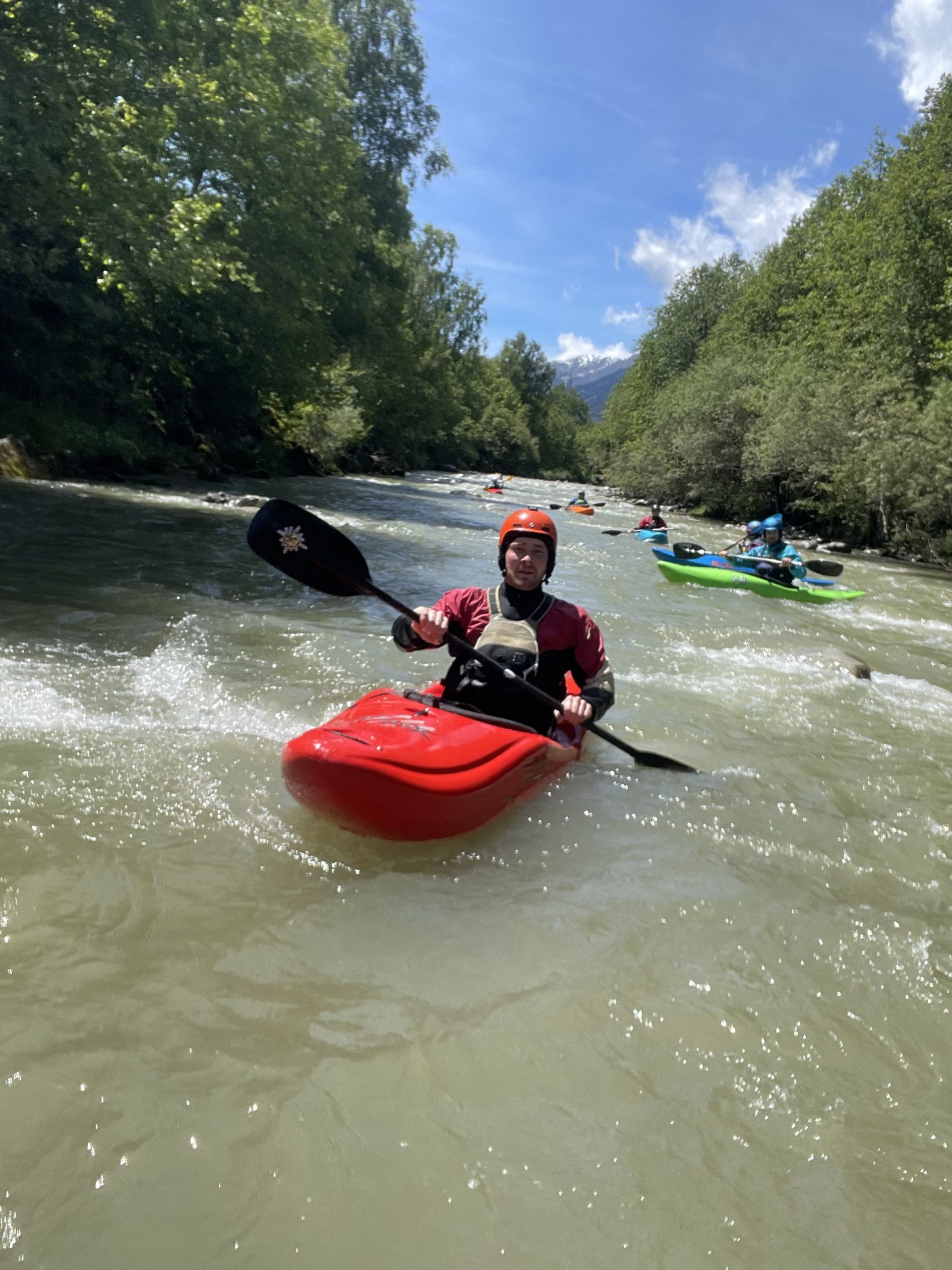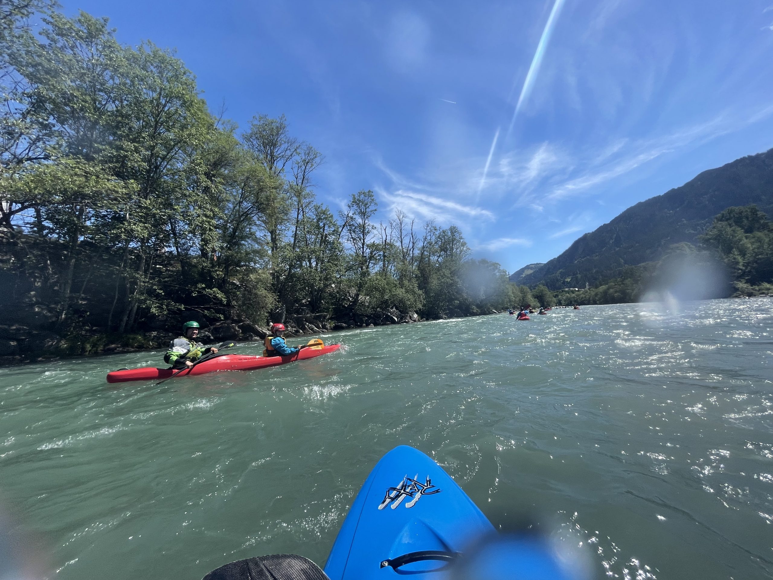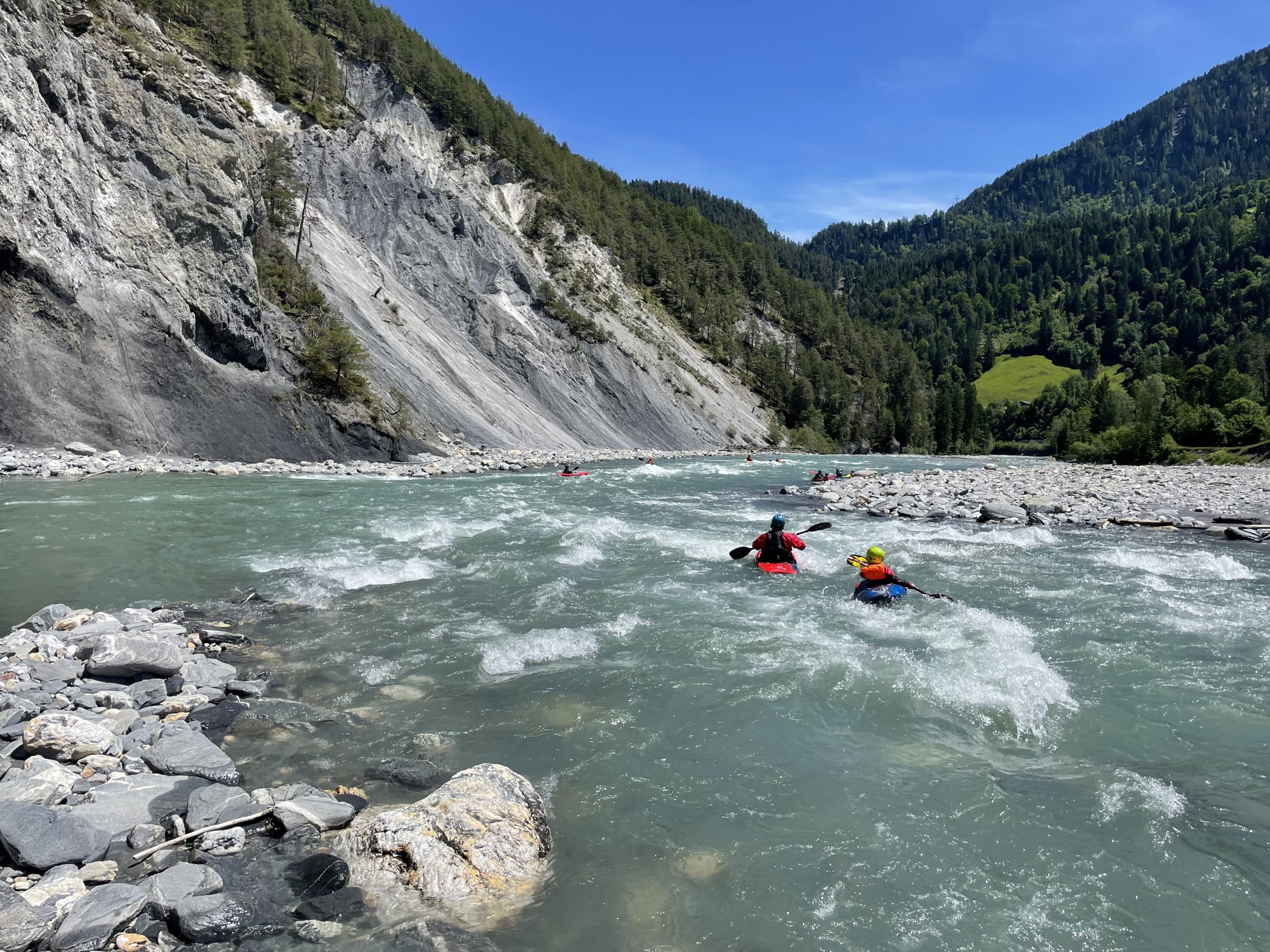 Nach der Anreise und dem Aufbau des Camps am Donnerstagmorgen stand zunächst ein gemeinsames Frühstück auf dem Programm, bevor die erste Paddeltour begann. Dabei wurde der Vorderrhein von Cumpadials bis zum Kraftwerk befahren. Bei besten Wetterbedingungen bot der Fluss ideale Voraussetzungen, um sich einzupaddeln und die eindrucksvolle alpine Landschaft zu genießen. In den darauffolgenden Tagen erkundeten die Brohler Kanuten weitere reizvolle Strecken, darunter die Etappe von Illanz bis Reichenau, die durch die spektakuläre Flimser Schlucht führt. Diese Passage zählt zu den landschaftlich schönsten Abschnitten des Vorderrheins und begeisterte die Teilnehmer mit ihren steilen Felswänden und türkisblauen Wasserpassagen. Für die erfahrenen Paddlerinnen und Paddler innerhalb der Gruppe stand zudem der Glenner auf dem Programm, ein anspruchsvoller Wildwasserfluss mit Schwierigkeitsgrad 4, der viel technisches Können erforderte. Auch hier zeigten die Brohler ihr Können auf bewegtem Wasser.